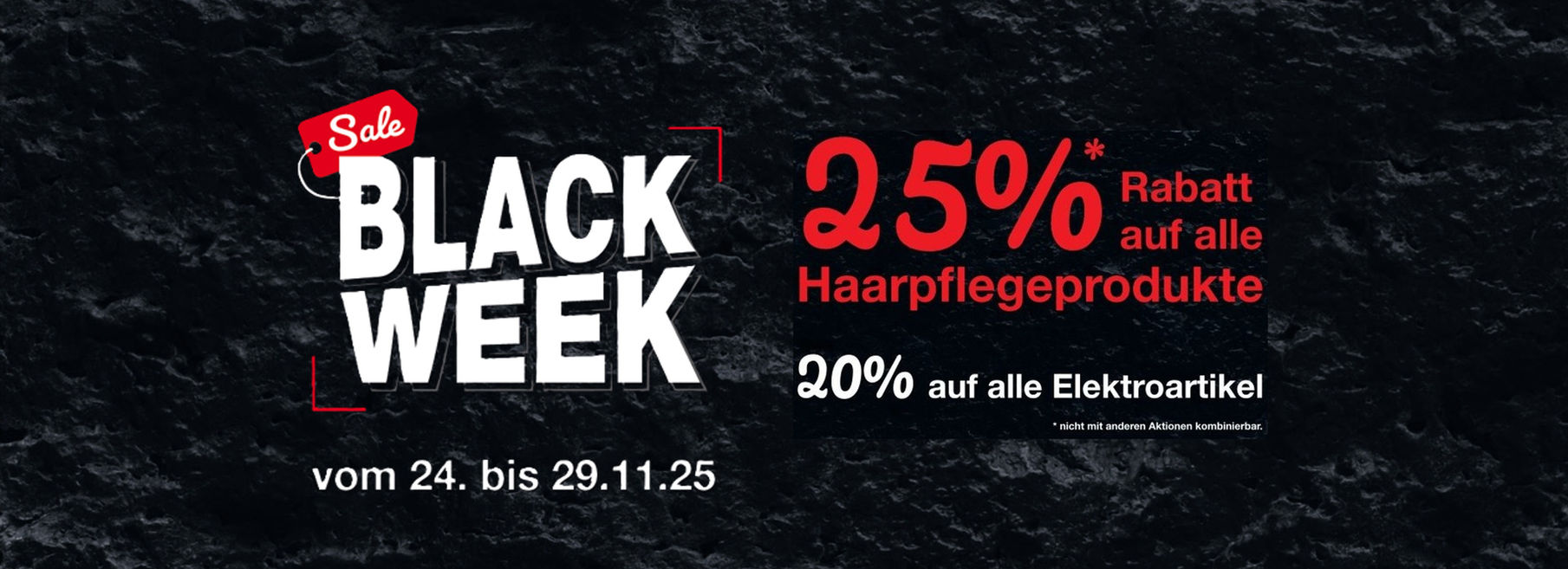 BLACK WEEK vom 24.11. bis 29.11.2025 +++ 25% auf alle Haarpflegeprodukte +++ 20% auf Elektroartikel